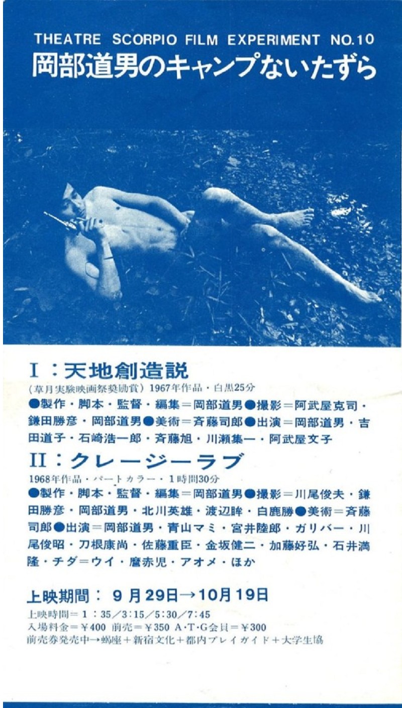 Michio Okabe’s subversive underground film was shot on 16mm in Shinjuku in 1968, and documents the radical spirit of Japan’s creative and artistic scene in those years. Crazy Love is structured as a collage of diverse activities and performers, including a happening by avant-garde art group Zero Jigen (Zero Dimension), Genpei Akasegawa’s fake bill, a march by futen (hippies), and parodies of adverts and cinema entertainment. Okabe was influenced by Kenneth Anger’s Scorpio Rising but developed his own distinctly kitsch, camp aesthetic, which is fully in evidence here; the director himself appears onscreen, acting out roles including James Bond. Challenging established social norms and codes of sexual behaviour, Crazy Love is a testament both to a liberated, experimental moment in art and film, and to an iconoclastic filmmaker.