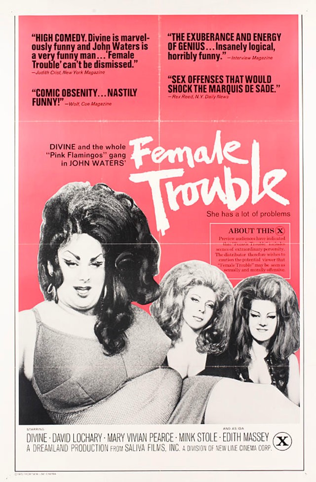 Glamour has never been more grotesque than in Female Trouble, which injects the Hollywood melodrama with anarchic decadence. Divine, director John Waters’ larger-than-life muse, engulfs the screen with charisma as Dawn Davenport, the living embodiment of the film’s lurid mantra, 'Crime is beauty', who progresses from a teenage nightmare hell-bent on getting cha-cha heels for Christmas to a fame monster whose egomaniacal impulses land her in the electric chair. Shot in Waters’ native Baltimore on 16mm, with a cast drawn from his beloved troupe of regulars, the Dreamlanders (including Mink Stole, David Lochary, Mary Vivian Pearce, Edith Massey, and Cookie Mueller), this film - the director’s favorite of his work with Divine - comes to life through the tinsel-toned vision of production designer Vincent Peranio and costume designer/makeup artist Van Smith. An endlessly quotable fan favorite, Female Trouble offers up perverse pleasures that never fail to satisfy.
